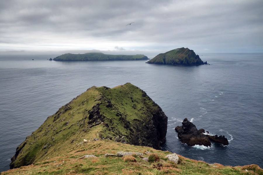 The island is long and narrow and tops out at just under a thousand feet. From the summit, there is a steep drop to the sea on one side and a more gentle drop on the other. I continued along the crest to the very end, scrambling over rocks to get as low and as far as possible – or was sensible. I sat there for some while. The sea was flat calm and I wondered just how many times a year this spot was quite so still and tranquil. It would far more often be ravaged by the wind and the crash of the waves. These rocks are as exposed to the wild Atlantic as it’s possible to get.