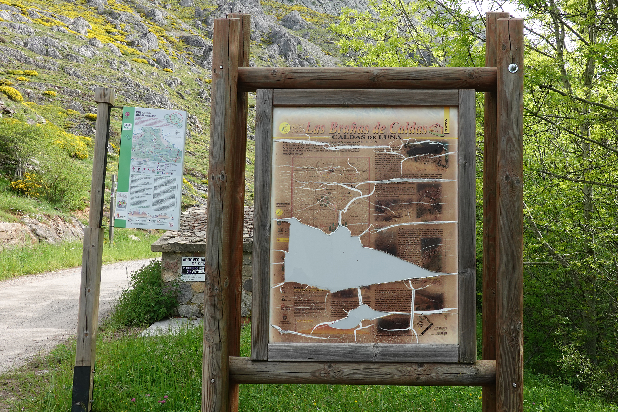 Wanting to spend a day in the mountains between Ovideo and Leon, it was a rather random call to stay at the spa hotel of Balneario Caldas de Luna, plucked from a number of choices on the internet. I’d done very little research, assuming that its magnificent situation would mean ready access to lots of walking trails. There turned out to be just one—Las Brañas de Caldas—with an unpromising, rather dilapidated information board. I’d bought a couple of 1:50,000 maps in Oviedo (one wasn’t sufficient because Caldas de Luna was inevitably right on the join between two—isn’t that always the case?), but they didn’t look like being of any great help in navigation. By the way, the more recent board is for the long-distance mountain bike trail traversing the length of the Babia y Luna National Park, one end of which starts here.