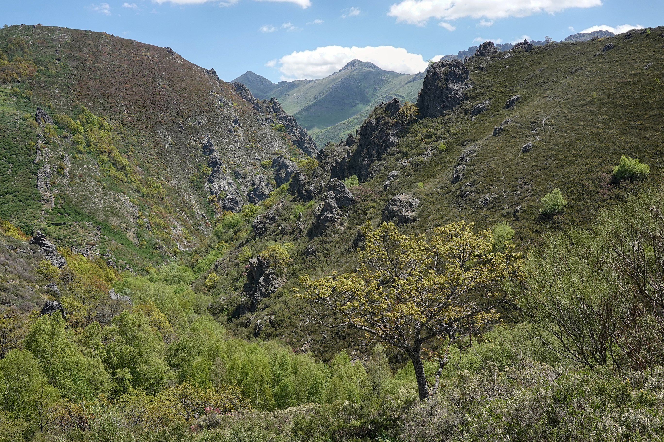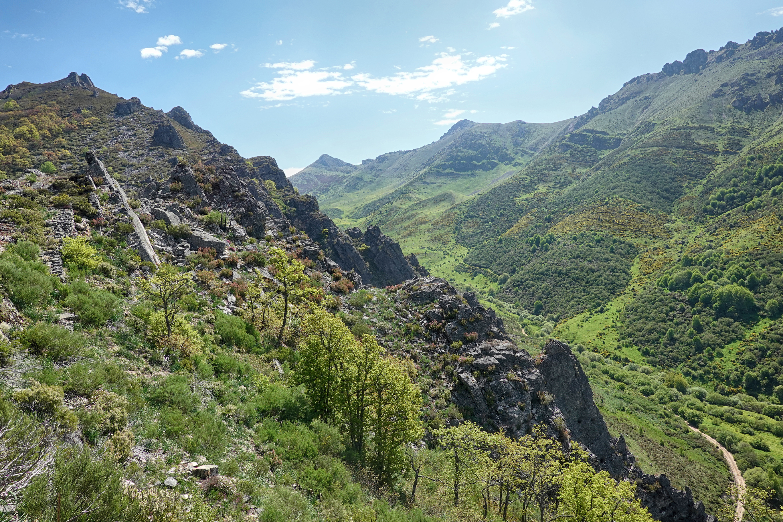 Before long, the trail rises above the trees and opens out to reveal fabulous views across the Carrio valley. The ridgeline to our right, looking east, is spectacular and I soon had an eye to the summit situated centre right in the photograph (Pico de la Brazosa, 1937m), which looks like it can be climbed easily (albeit steeply!) from the valley bottom.