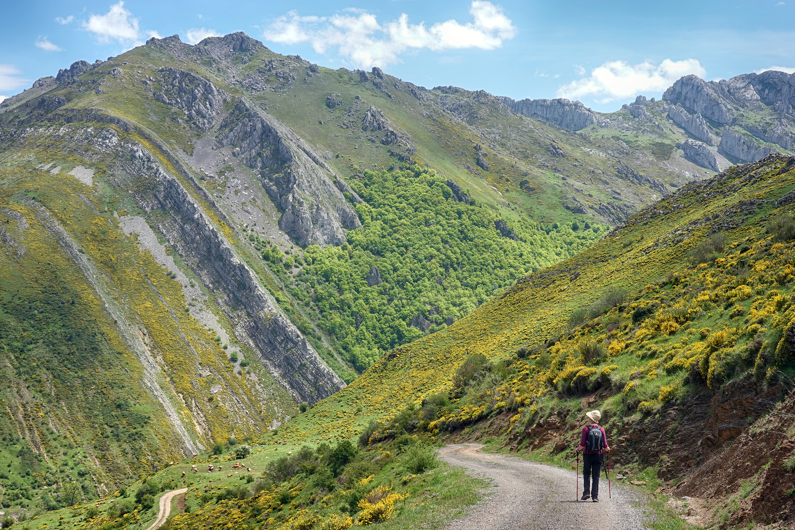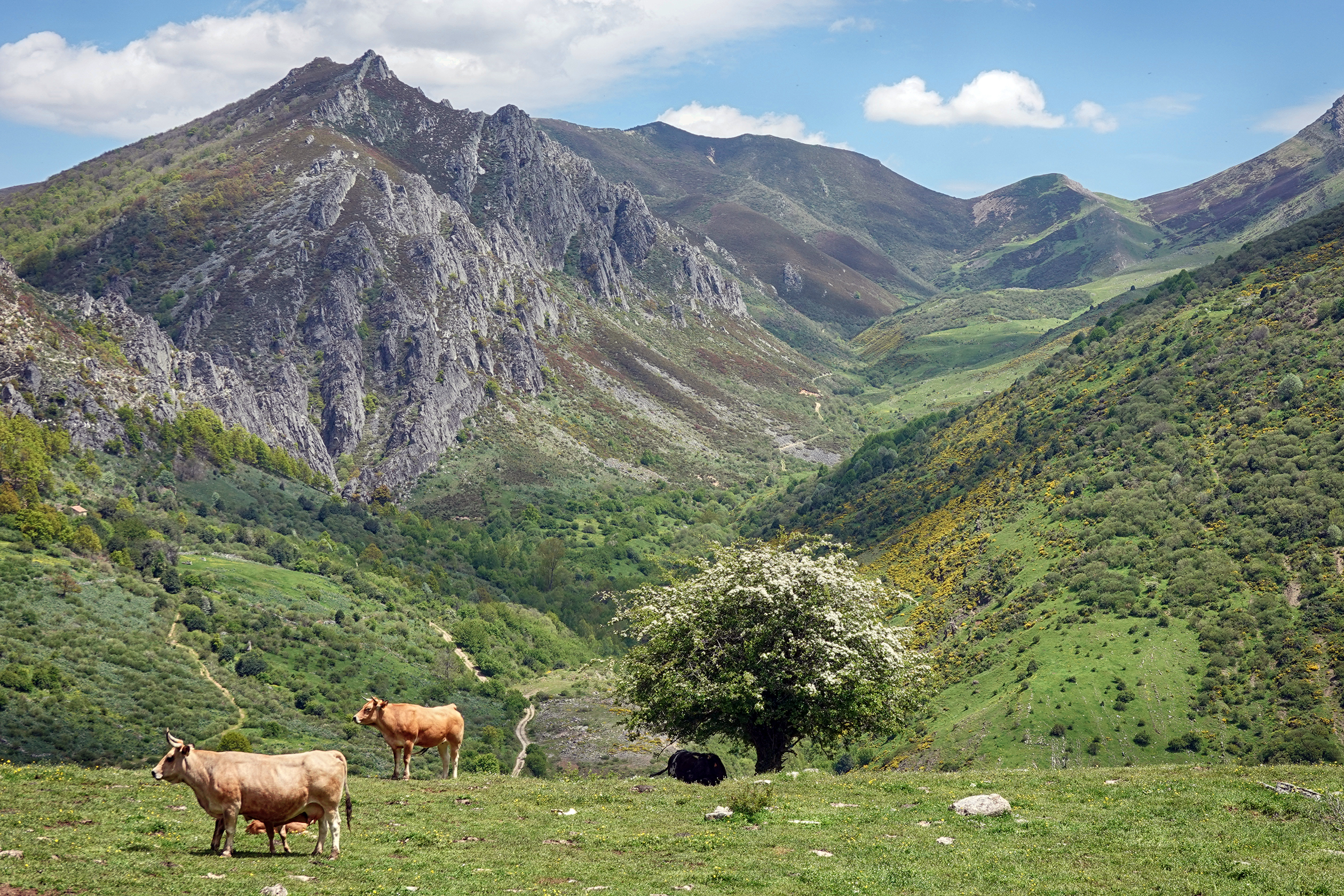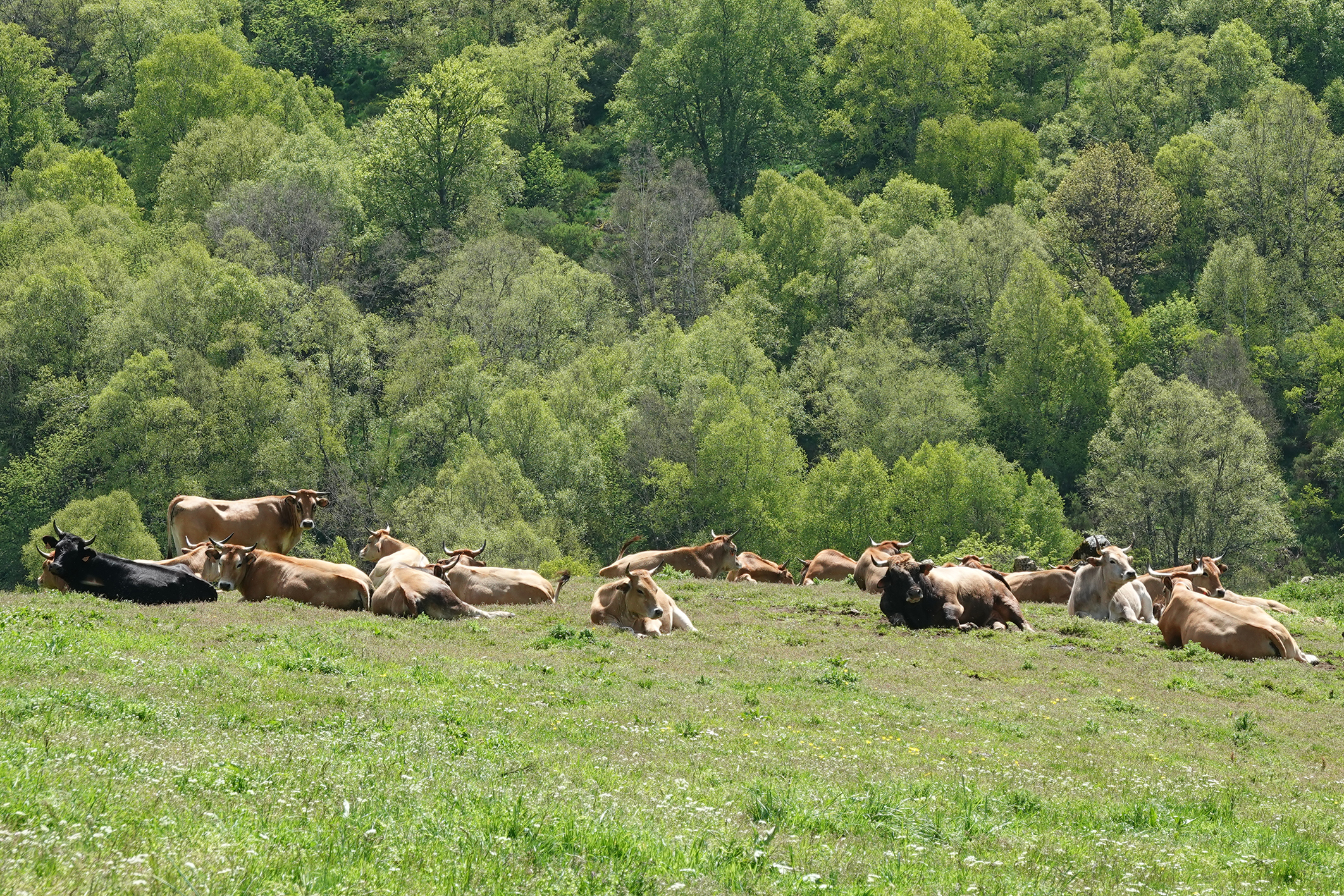 Our trail continues to the first Braña, the local name for a high-altitude meadow or pasture. They are typically used for seasonal grazing of livestock, especially during the summer months when the lower valleys become too hot and dry. Shepherds traditionally move their flocks between different grazing areas throughout the year. We found a herd of cattle.