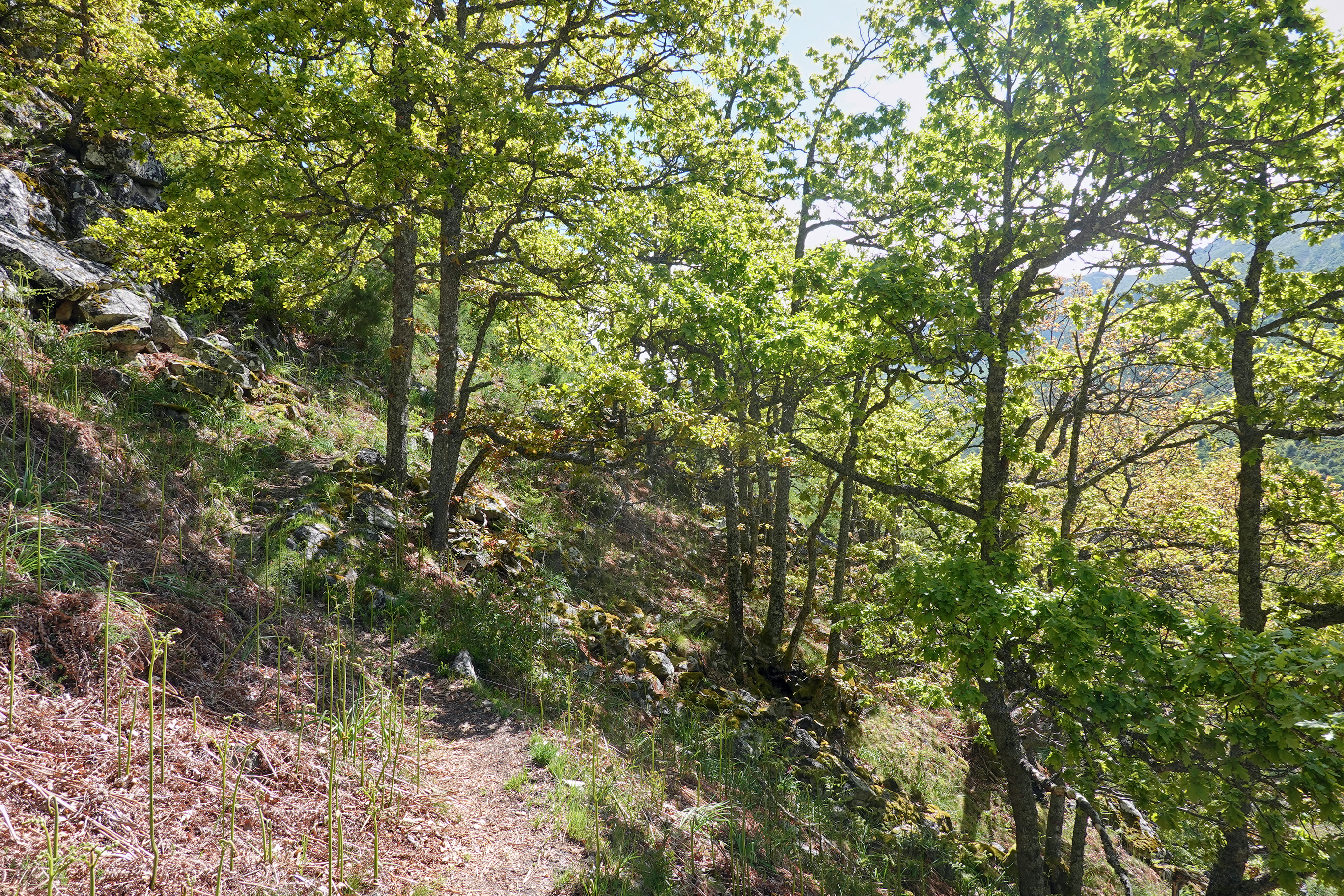 Shortly beyond this tunnel, the track passes back under the motorway through a smaller one to where a choice has to be made as to which direction to walk the circular loop. To the left is a long gradual climb on a good track. To the right, another good track leads to a steeper, rougher climb, meaning that the later walking is easier. For no good reason, we chose the latter, doing the circuit anti-clockwise. It’s easy to go wrong right away if one’s not careful. After going back over the motorway, just as it disappears into the mountain, you need to take a left onto a lesser track within about two-hundred yards. A signpost can be seen about fifty yards away, pointing back in the direction you’ve just come. Take a sharp right back on yourself there and you’re on the trail proper, climbing gradually through beech forest and oak groves.